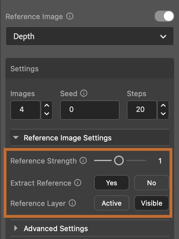 The Depth reference type is a good choice for when your reference image displays a sense of space and depth, like a serene landscape stretching out to distant mountains, a quiet street vanishing into a horizon, or a bustling room filled with objects near and far. Use this reference type when you want your new image to match the depth in your reference image, reflecting the sense of three-dimensionality and perspective.Foggy Dark Fantasy City